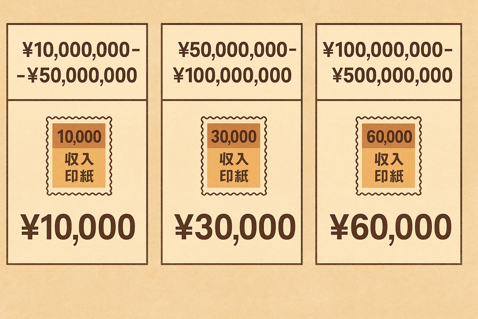5,000万円超~1億円以下では3万円、1億円超~5億円以下では6万円が課されます。契約金額が増えるほど税額も上昇するため、取引規模に応じた準備が必要です。